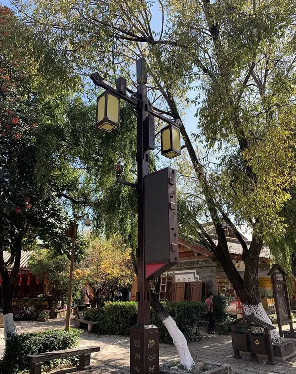 束河古镇是纳西先民在丽江坝子中最早的聚居地之一,是茶马古道上保存完好的重要集镇,古镇中保留着许多古民居。智慧灯杆的进入无疑给这样的古镇增添了一抹别样的风情,给古镇带来了科技感,进驻的智慧灯杆既要考虑性能又要考虑与古镇风格的整体划一,既不破坏古镇景致,又能锦上添花,中国风灯杆造型的诞生完美解决了这一难题。